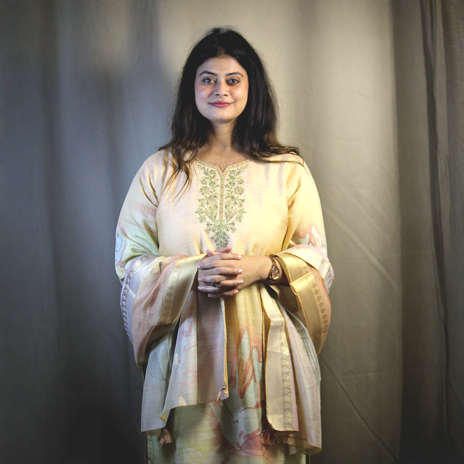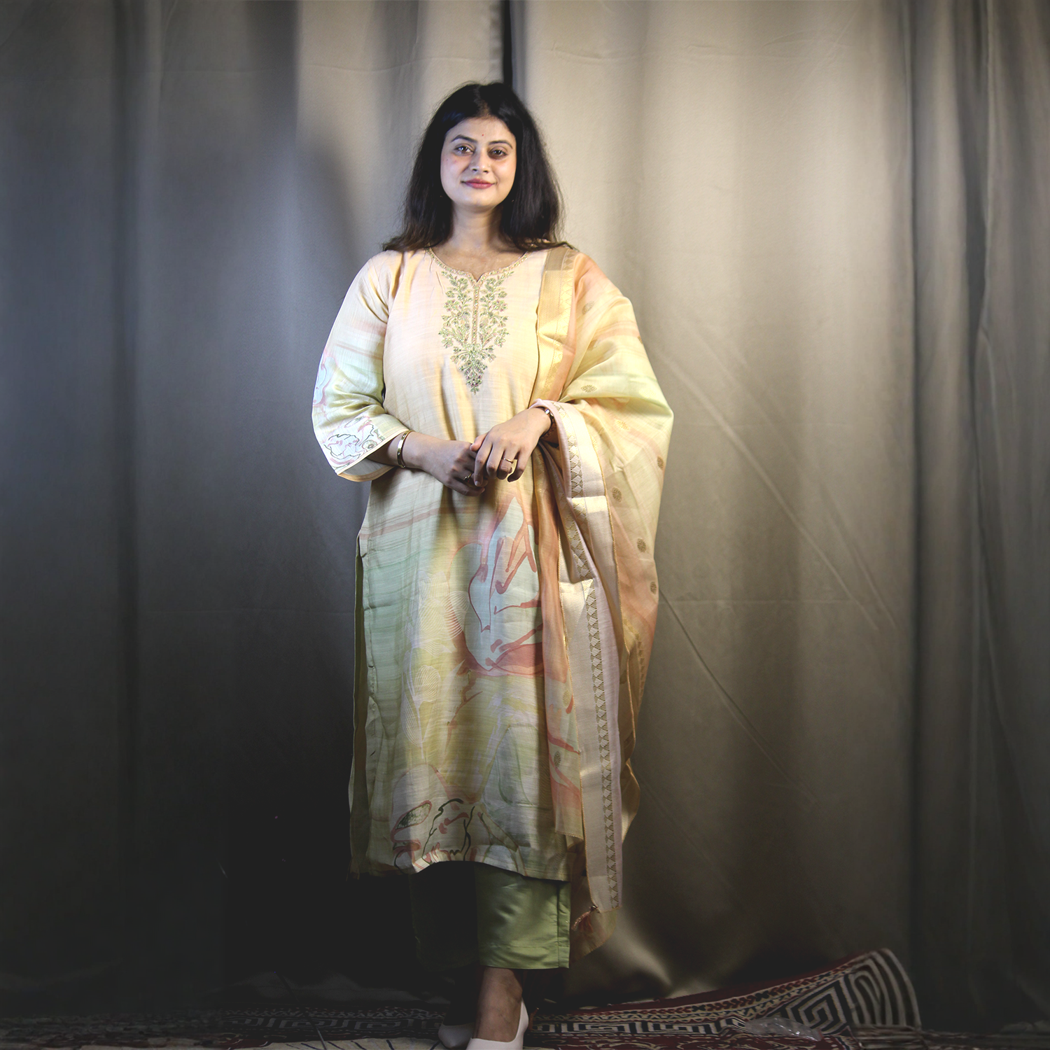 Dupatta: Coordinated silk dupatta with tassel ends and pastel pattern