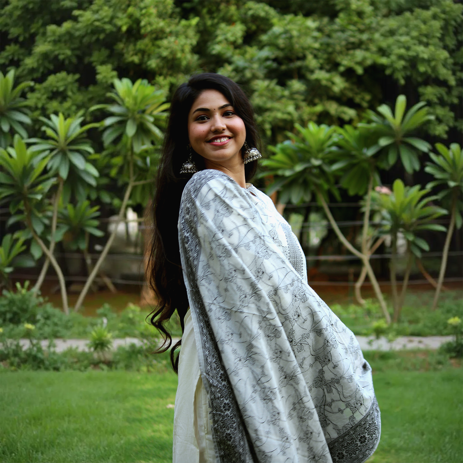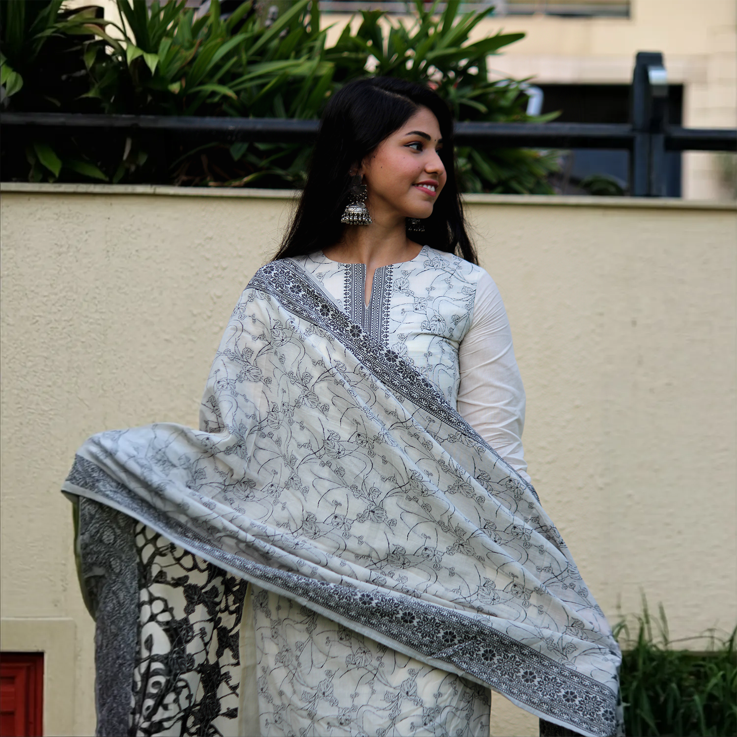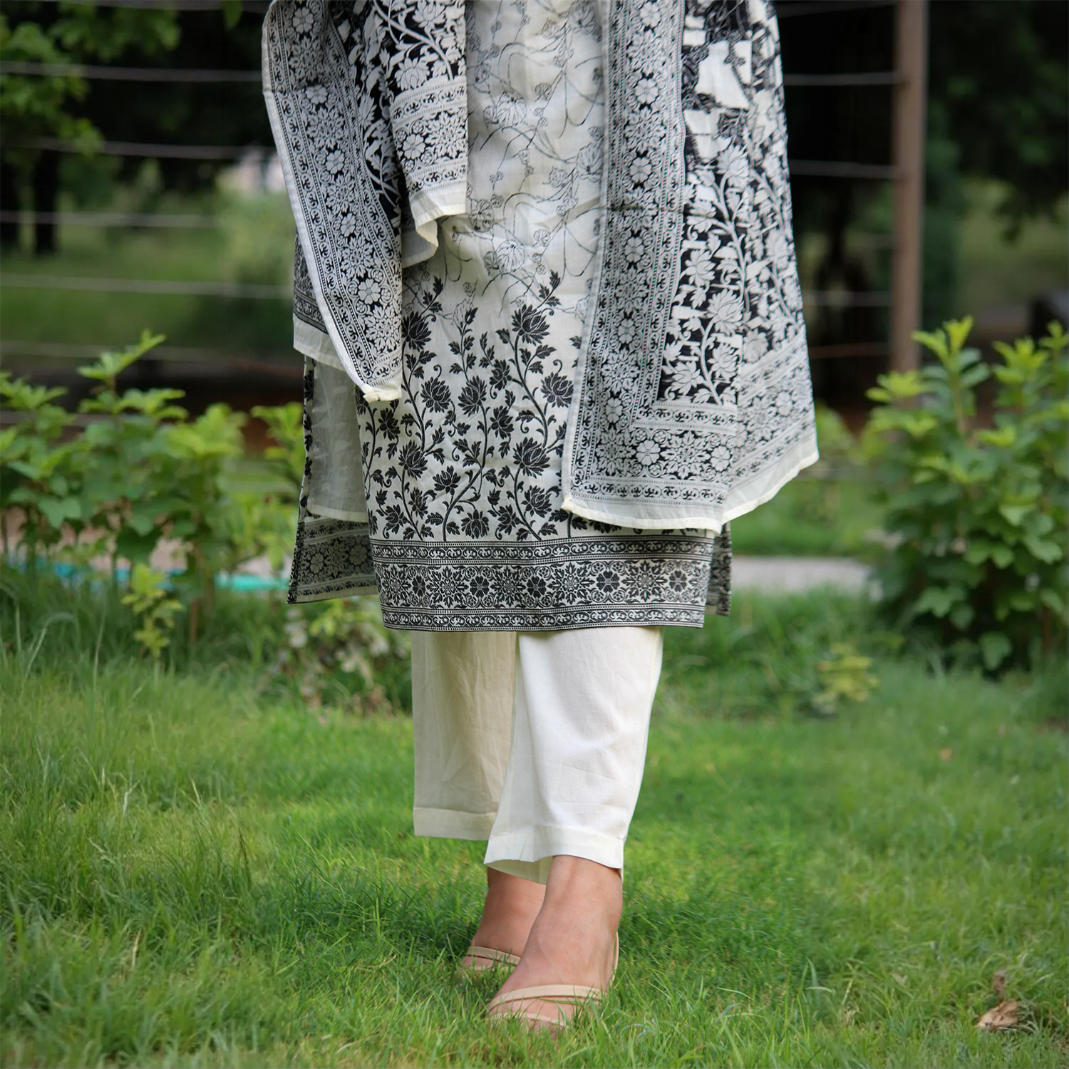 Black & Off-White Warli Handloom Cotton Kurta Set