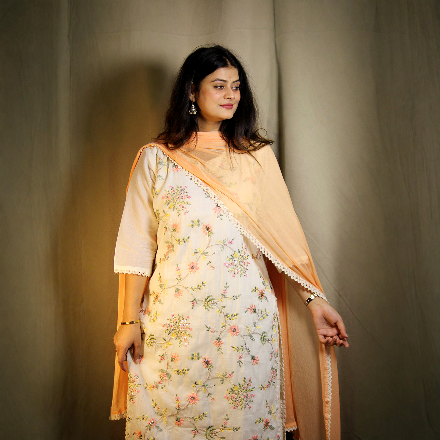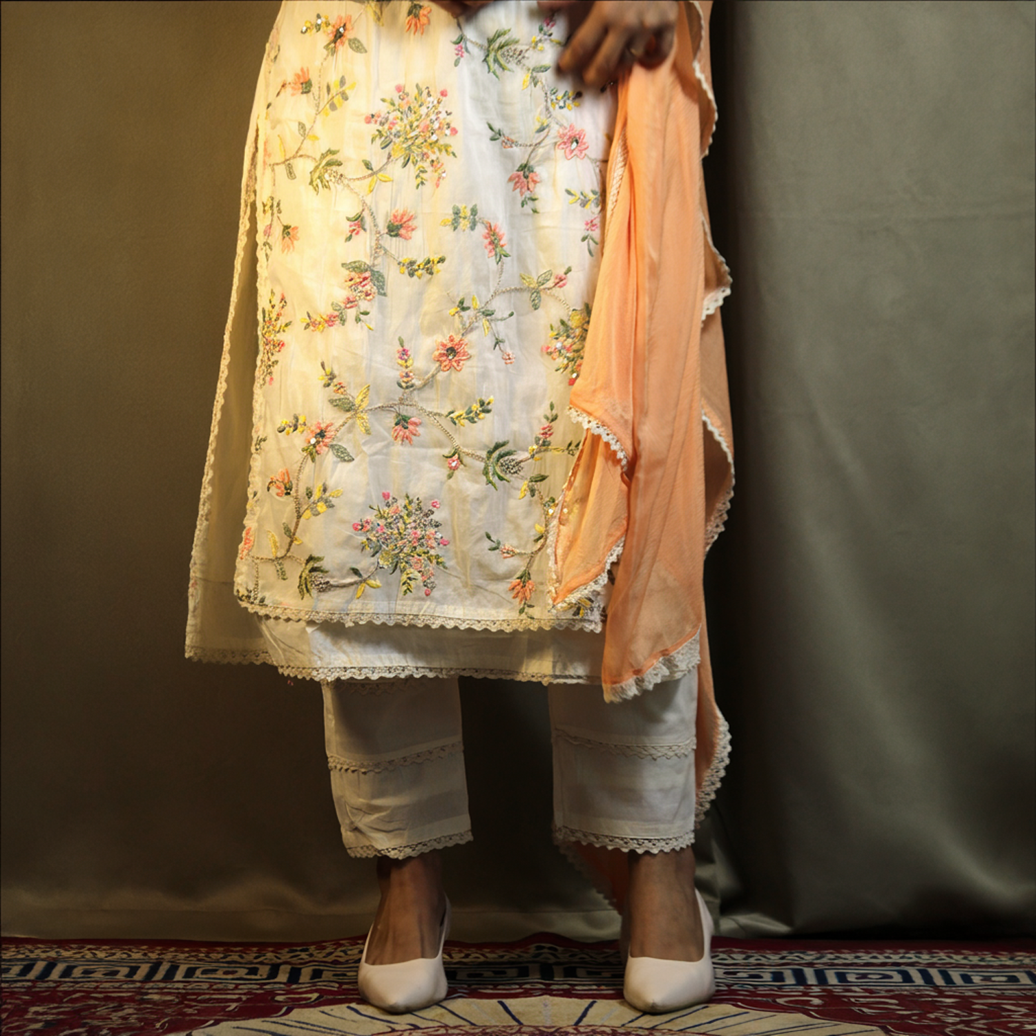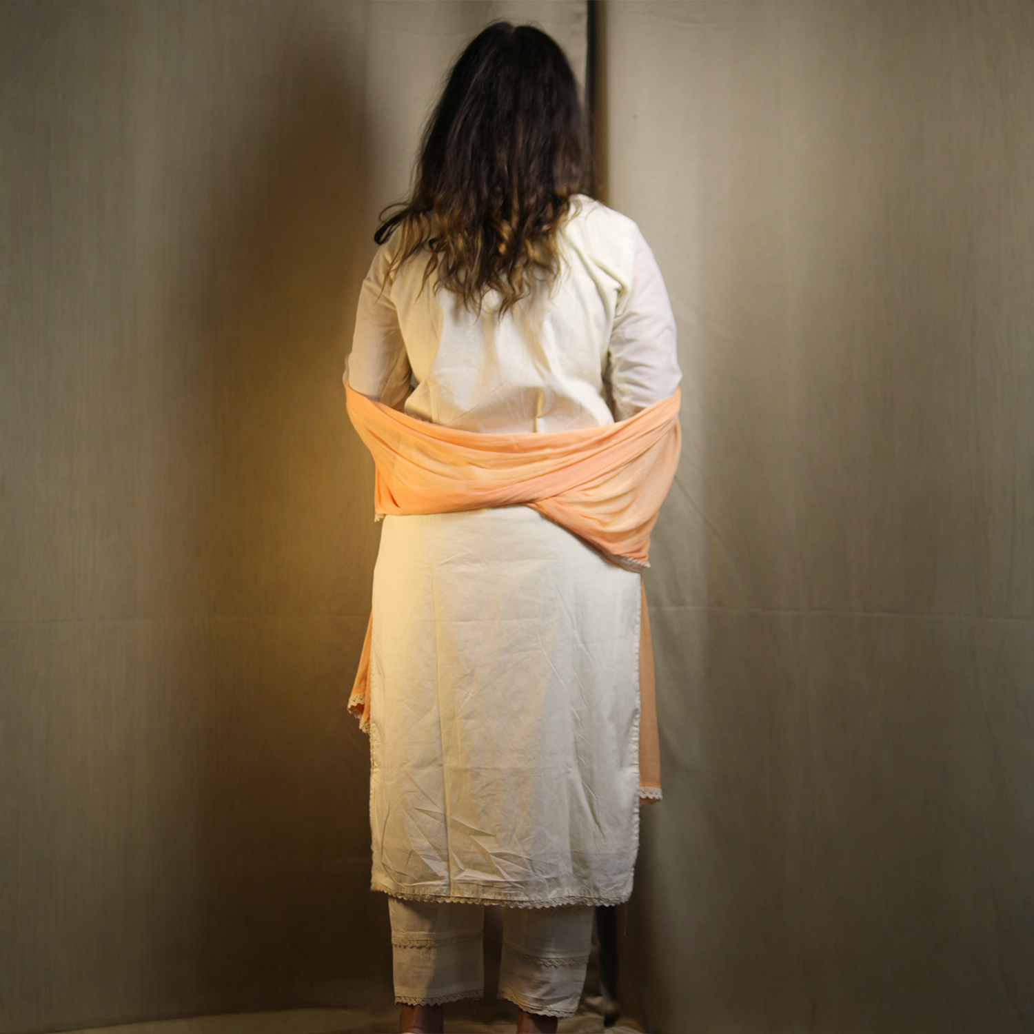 Dupatta: Coordinated cotton dupatta in peach, finished with elegant white lace