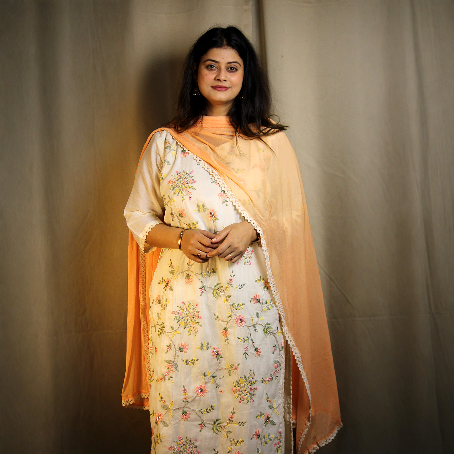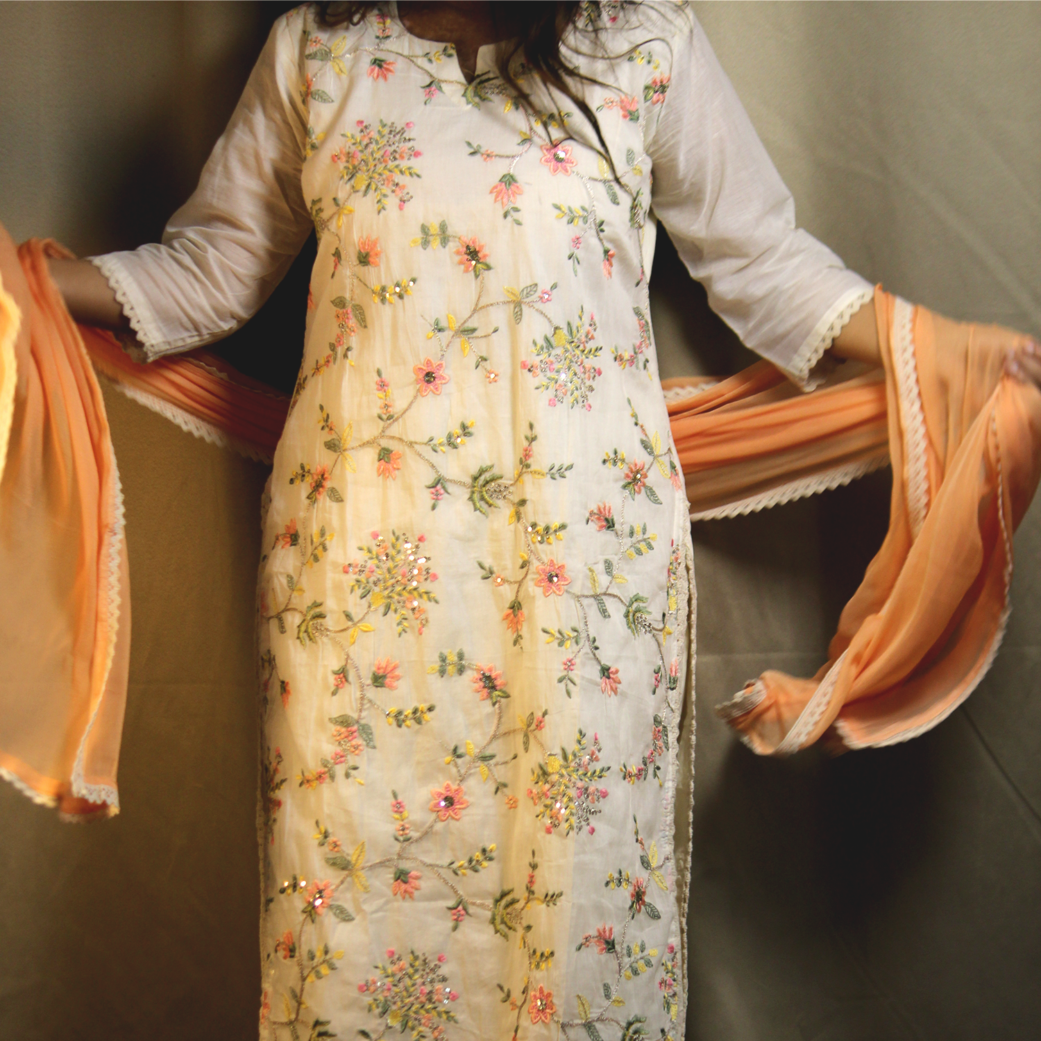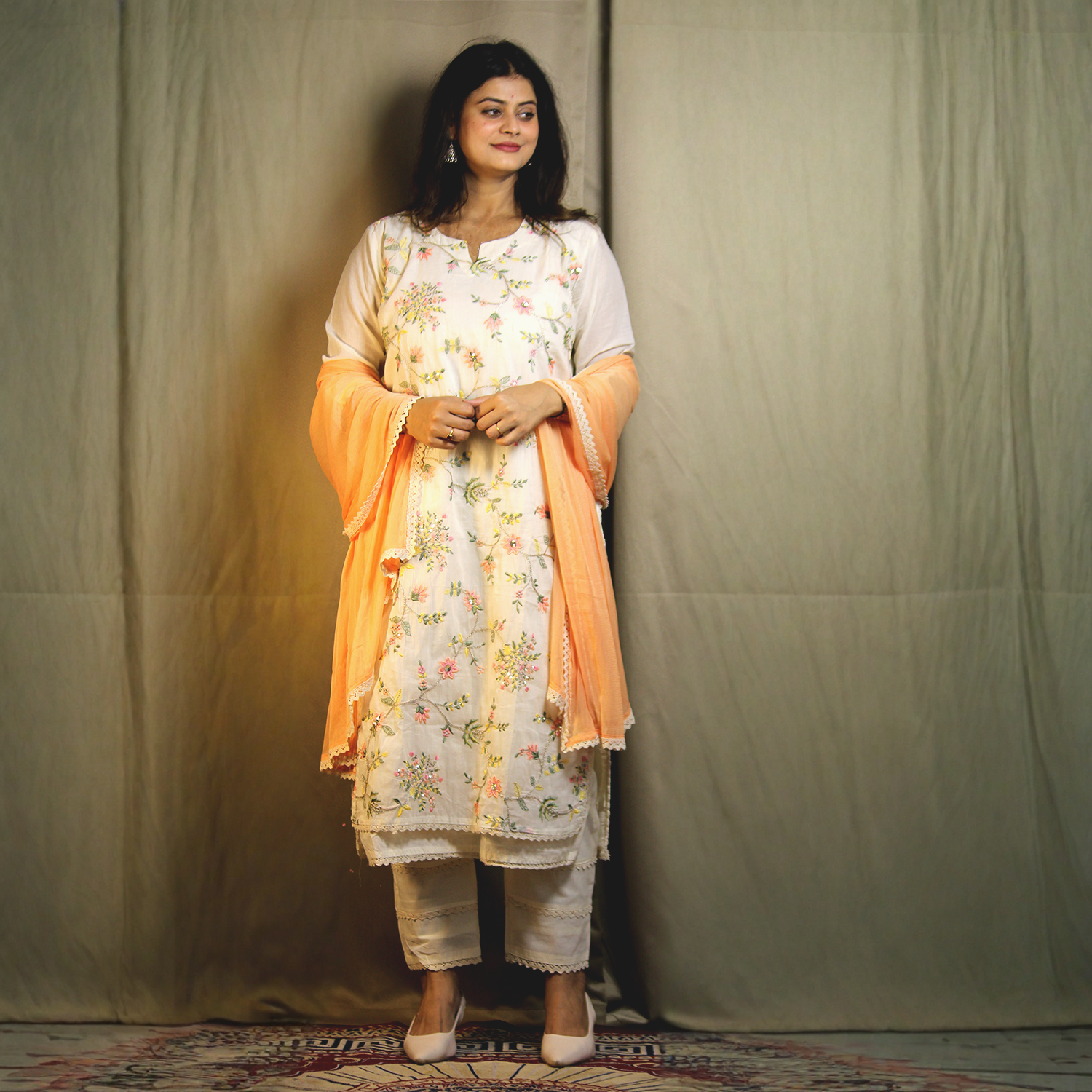 Dupatta: Coordinated cotton dupatta in peach, finished with elegant white lace